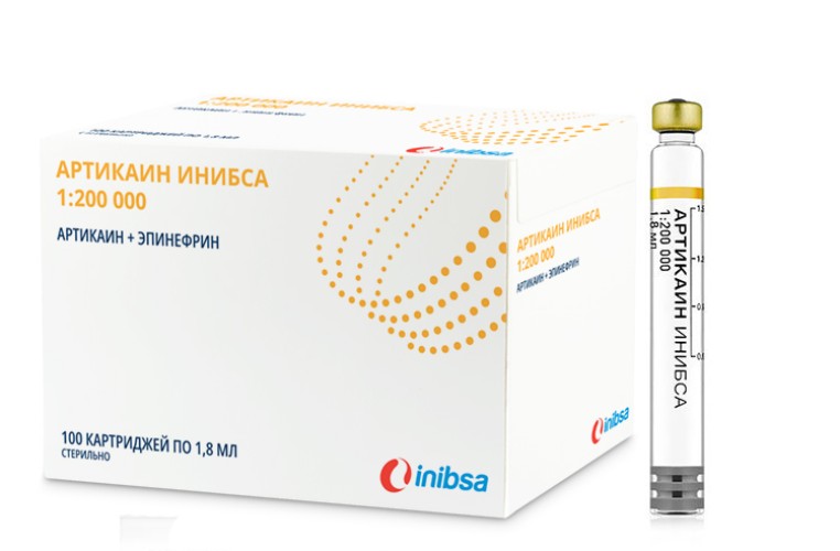 Лекарственная форма Раствор для инъекций. Описание лекарственной формы Прозрачный бесцветный или слегка окрашенный раствор, свободный от механических включений. Фармакодинамика Препарат Артикаин ИНИБСА, применяемый для местной инфильтрационной и проводниковой анестезии в стоматологии, является комбинированным препаратом, в состав которого входит артикаин (местноанестезирующее средство амидного типа) и эпинефрин (адреналин) (сосудосуживающее средство). Эпинефрин добавляется в состав препарата для пролонгирования действия анестезии. Артикаин оказывает местноанестезирующее действие за счет блокады потенциал-зависимых натриевых каналов в клеточной мембране нейронов, что приводит к обратимому угнетению проводимости импульсов по нервному волокну и обратимой потере чувствительности. Препарат Артикаин ИНИБСА оказывает быстрое (латентный период — от 1 до 3 мин) и сильное анестезирующее действие и имеет хорошую тканевую переносимость. Продолжительность анестезии составляет не менее 45 минут для дозировки 40